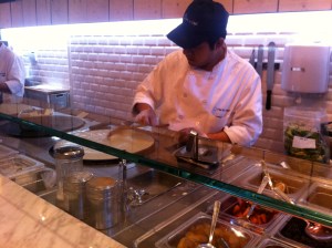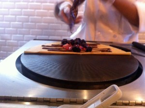 The menu includes an array of savory and sweet crepe options, features Illy coffee and espresso drinks and healthy bottled beverages. Some crepe examples include: 1) Tomato, Mozzarella and Basil 2) Smoked Salmon, Cream Cheese, Spinach and Capers 3) Mushrooms, Gruyère and Tomato sauce. On the sweet side, there is the simple Sugar and Butter, several types of chocolate treats including “Noir”, the dark chocolate option, and a traditional French favorite Nutella. Plus you can add “Sweet Toppings” like fresh fruit and nuts. All the ingredients looked extremely fresh.