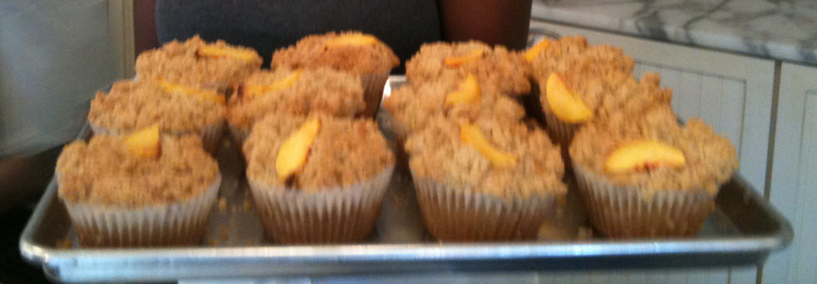 Although the Apple, Cranberry, Walnut muffin is still my favorite, don’t miss out on the seasonal Peach muffins, which will be available on select days through October. They are delicious – filled with chunks of fresh peaches and a sweet, crumble top. I’ve posted a picture of a tray right from the oven.