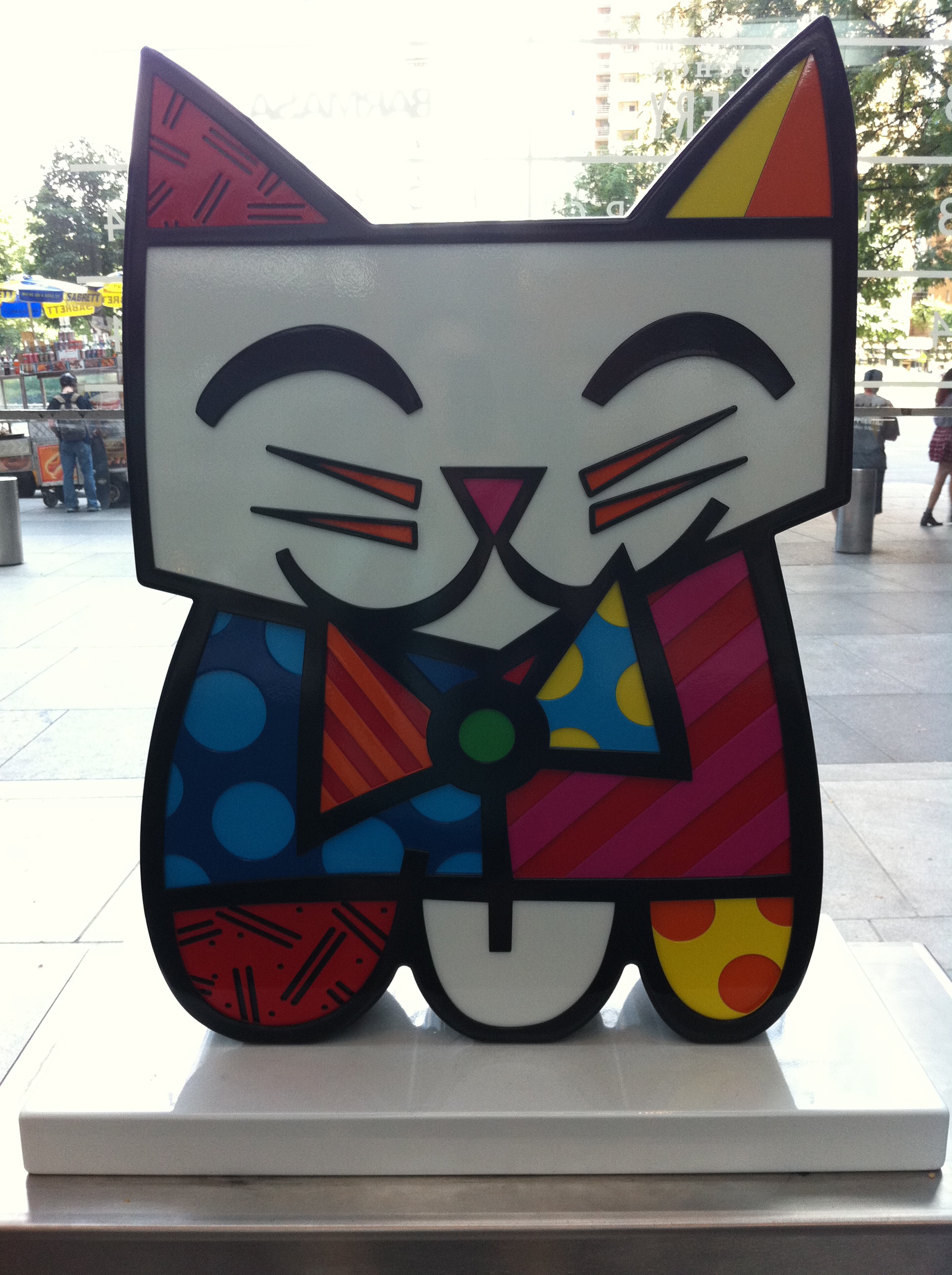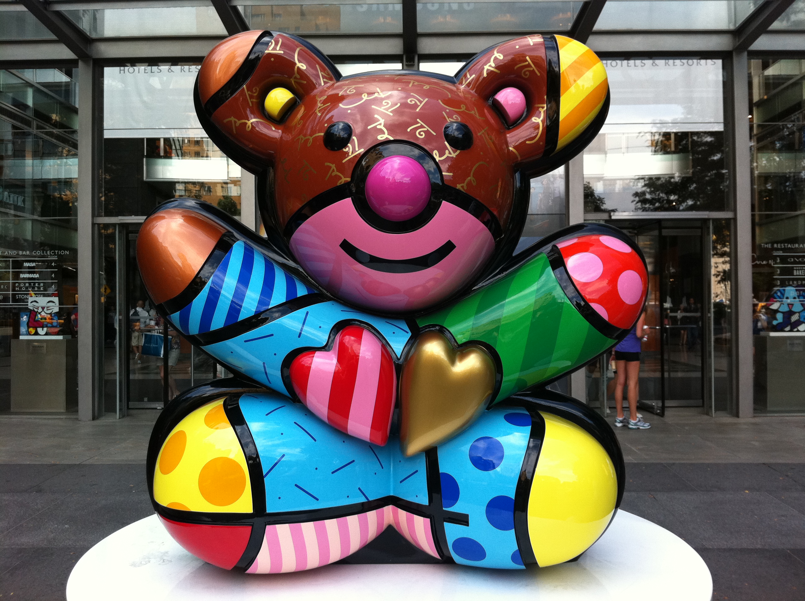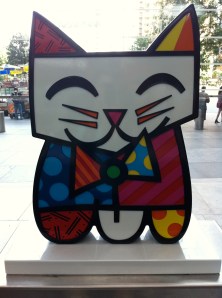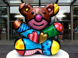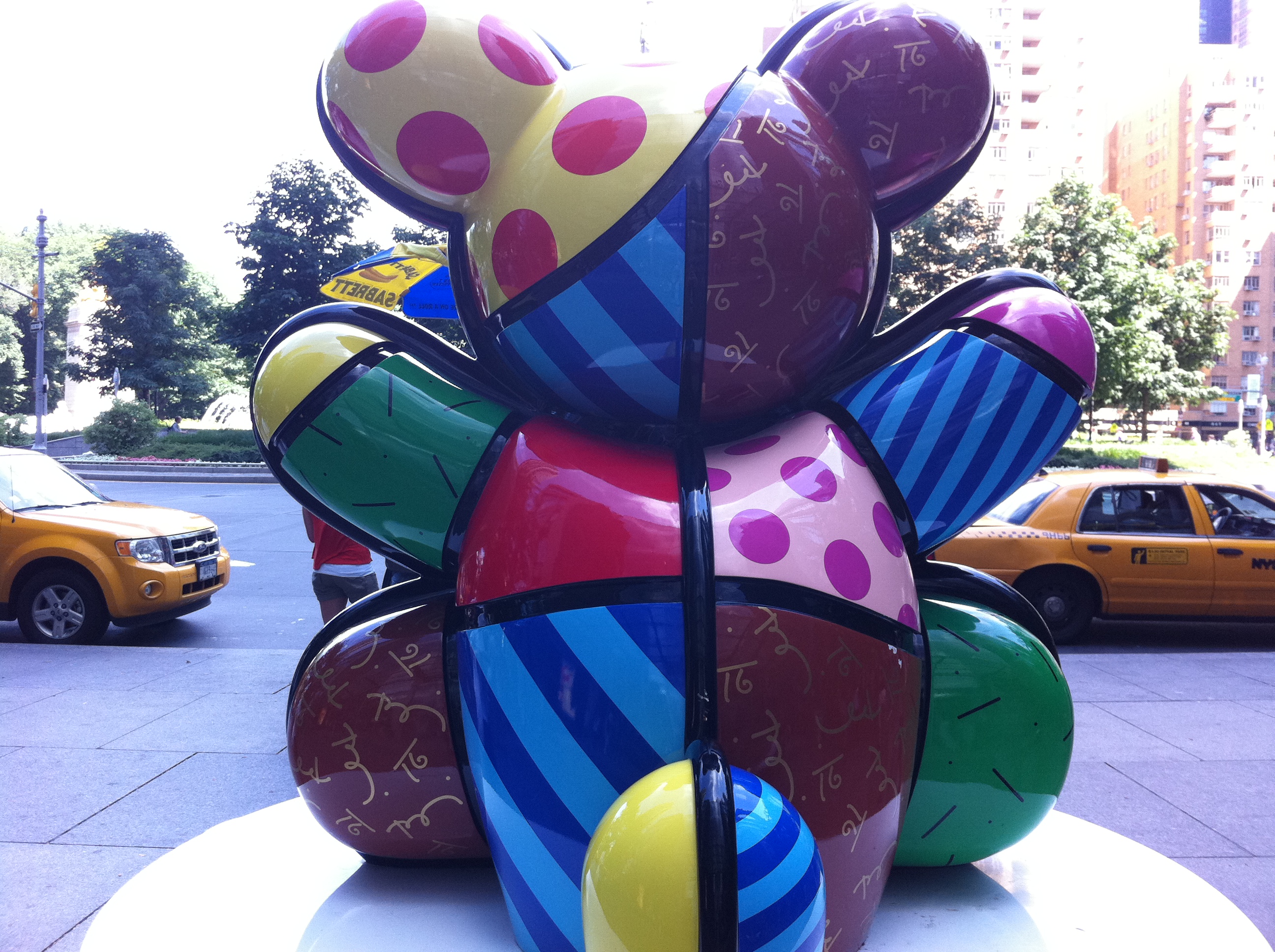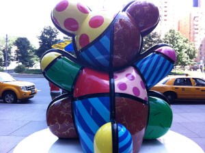 Last time I was walking by the Time Warner Center, I noticed a colorful happy-looking teddy bear sculpture (that reminded me a bit of Hello Kitty). I stopped to find out more and learned that it was created by Brazilian artist Romero Britto to benefit Best Buddies International, a nonprofit organization that enhances the lives of people with intellectual disabilities. I’ve attached photos below of the Best Buddies Friendship Bear right outside the front entrance to Time Warner and the cat and dog sculptures inside the main doors of the lobby. Perfect for summer fun!