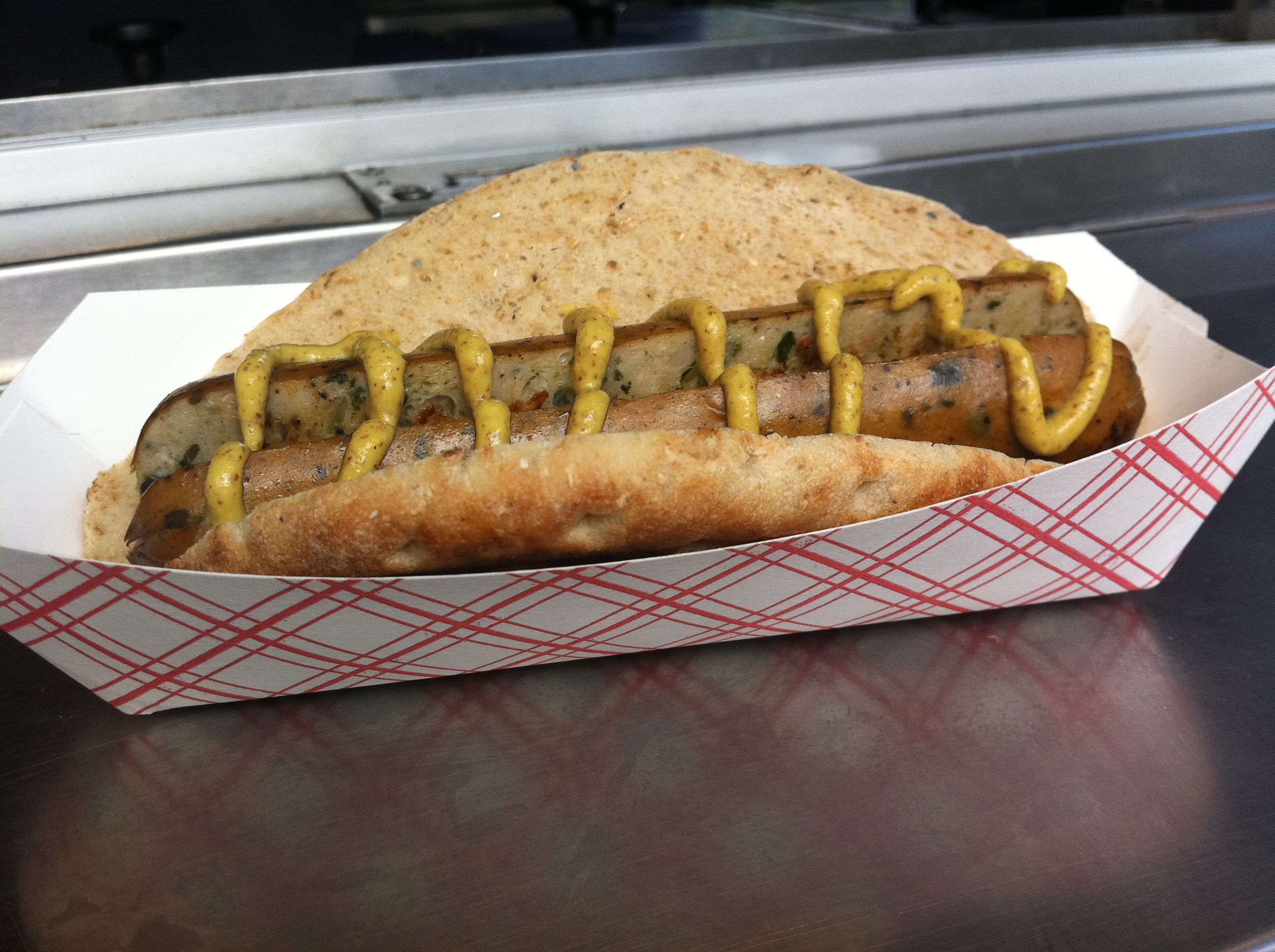 Good to Go Organics offers an organic menu of Hot Dogs, Sausage and Vegetarian dogs, Snacks, Sweets, Fruit, and cold and hot drinks. All hot dogs and sausages are from APPLEGATE, known for its organic foods (eg. APPLEGATE brand sells products in Whole Foods). The Vegetarian options include a Jumbo Veggie Soy Dog with only 80 calories and 15 grams of protein, as well as an Italian Style Veggie Soy Sausage with 140 calories and 13 grams of protein. Toppings include Organic Local Sauerkraut, Onions, Sweet radish. I tried the Spinach and Feta Sausage on a multigrain bun pictured below. I’m not a big hot dog fan personally, but this was delicious.